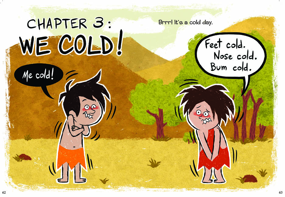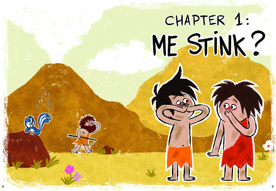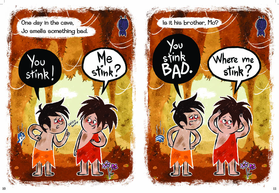 “As Tammi Sauer so ably demonstrated in Me Want Pet! (BCCB 4/12), the truncated, half-grunted dialogue that we collectively attribute to stereotyped cavemen makes superb fodder for beginning readers. The cave boy brothers Mo and Jo Boulder (yes, they do live anachronistically with mammoths and dinos—get over it) debut in three chapter-length comic adventures, mashing up standard full-page picture- book illustrations with the word bubbles and narration boxes of graphic novels. Their first issue is olfactory. Something stinks, and although the viewer will readily identify a giggling skunk as the culprit, Mo and Jo exchange accusations: Mo’s pits? Jo’s feet? Their filthy cave? Next comes a clumsy game of hide-and-seek, in which Mo has a hard time explaining the rules to a willing but addled Jo. Finally, the brothers are cold, and they try unsuccessfully to muster ideas from nature to address the problem (beating rock against rock, or against turtle; sticking bird feathers to their skin; pulling fur off a bear—never a good idea) until they realize that a cave filled with friends generates heat and amity. Collet-Derby’s illustrations feature a palette of bold earth tones, with touches of contrasting color for background figures; thoughtful design helps newbies to distinguish the two boys—Mo with his red shoulder-draped animal hide and white speech bubbles, and Jo with his boxer-styled hide and black speech bubbles. A limited vocabulary, oversized font, and lots of word repetition will quickly build reader’s confidence, and the goofy mini-plots and earthy humor will have them looking for the sequel.” – The Bulletin of the Center for Children’s Books