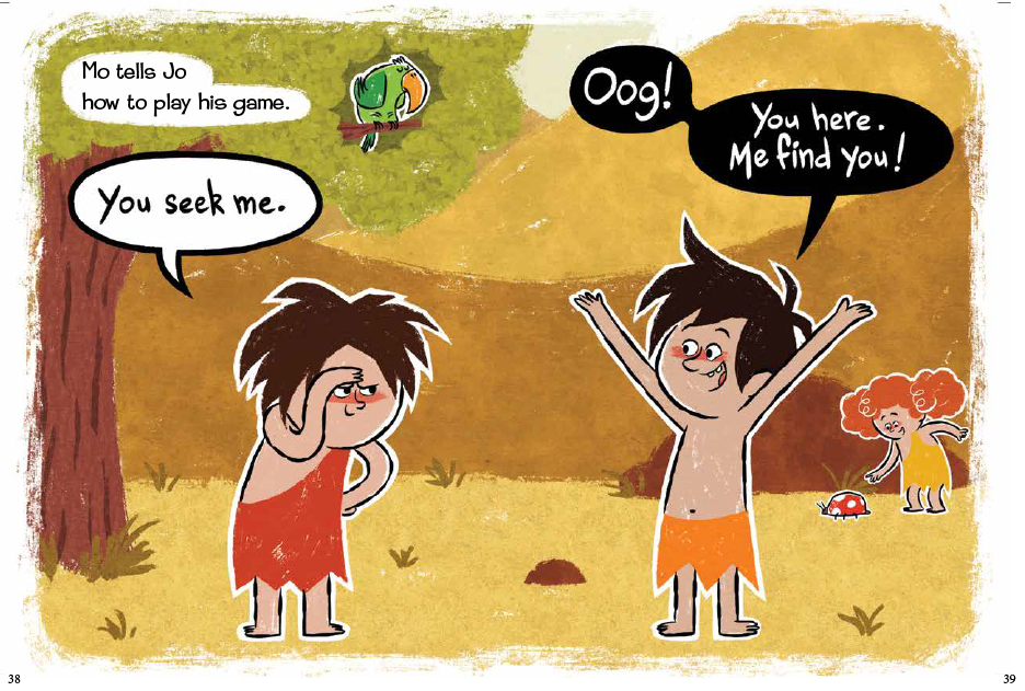 “Meet the Boulder Brothers, Mo and Jo, in this new beginning reader series. In three short chapters, these silly caveboys attempt to eliminate a cave odor, learn how to play hide-and-seek, and solve the problem of being cold. Each spread offers one or two sentences from the narrator, while Mo and Jo’s speech bubbles leave out some words, resulting in simplified cave speak. For instance, on one spread the narrator explains, “Jo sees some birds. The birds do not look cold.” Meanwhile Mo and Jo say, “Feathers keep warm” and “Need feathers.” The uncomplicated illustrations are presented in colors and hues perfectly suited for a caveman setting. The book is slightly larger and thicker than a typical book in the new reader’s section, giving the impression of a “sizable” read yet the word count is only a step above Mo Willems’s “Elephant and Piggie” titles (Hyperion). In fact, these caveboys’ antics are sure to attract Willems’s readers who are ready to move on to other titles. VERDICT Funny and adventurous, Mo and Jo will appeal to new readers, even though parents may be concerned about proper grammar.” – School Library Journal